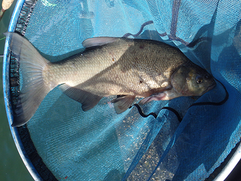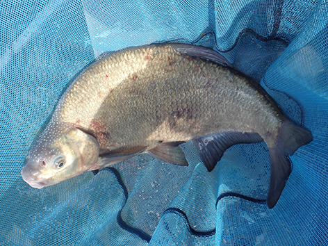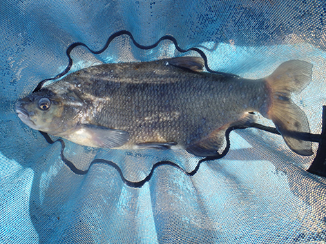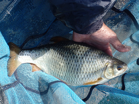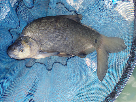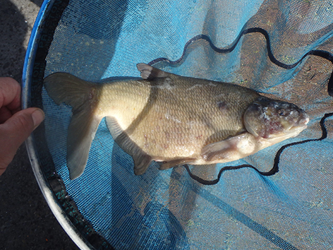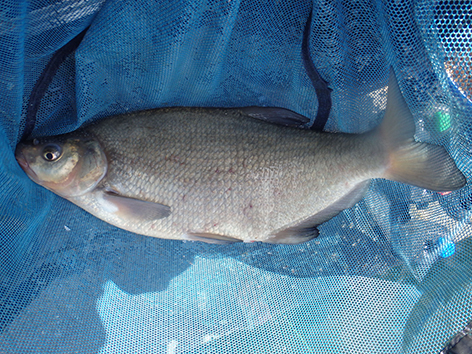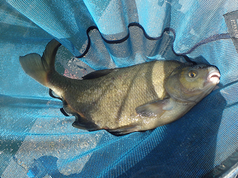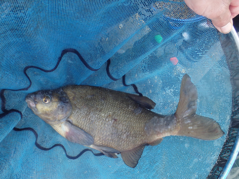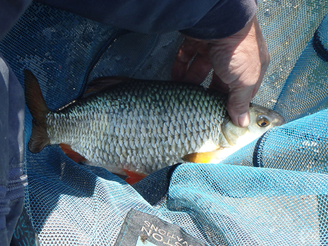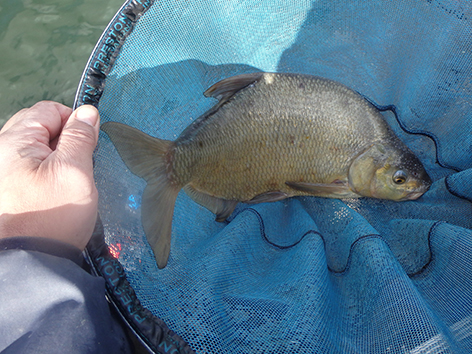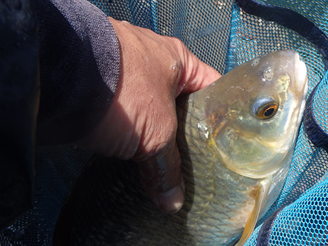 Bij mijn buurman is het bijna elke drift een kromme ronde stok met het elastiek er meters uit. Maar ze zijn niet te netten. De vis zien we nu ook boven onze voerplek aan het oppervlak spartelen. Ze zitten elkaar achterna tot aan het wateroppervlak. Toch zitten ze dus wel op het voer.