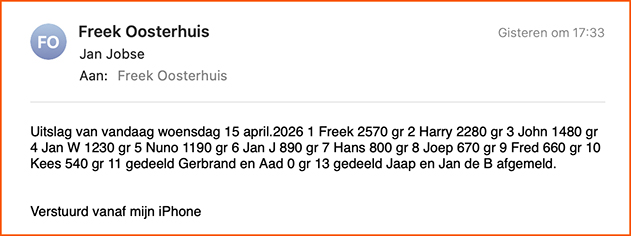 Maar jan Joep op stek 3 die heeft net geen vijfentwintig kilo platten in zijn netje. De terechte winnaar vandaag die had zijn zaakjes het beste voor elkaar. Dus allemaal volgende week met 50gram korven vissen zegt hij. Want Nuno mag zeggen waar we gaan vissen en de 8vijvert valt af bij hem die die in gedachte had. Nee hier heeft iedereen vis kunnen vangen dus. Ik weet niet of iedereen achteraan het er mee eens is maar Harry is dan met vakantie naar de zon in Turkije dus het zal hem een biet zijn vertelde die al.