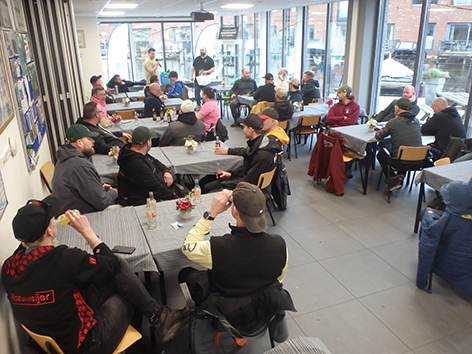Gelukkig is de koffiemachine weer gemaakt na het bezoek aan het kleinste kamertje. Een bakkie pleur kunnen we wel gebruiken na twee uur in de auto te hebben gezeten. We kijken nog wat rond en spreken weer wat mensen als dan na de briefing iedereen naar buiten kan voor de groepsfoto.