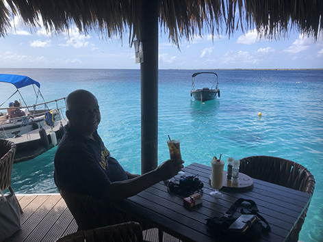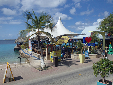 We krijgen trek. En de aanbeten lopen drastisch terug. Bij Sebastian’s Beach achter ons gaan we niet eten vandaag. Daar is de kaart toch wat klein. Ik heb trek in garnalen en Marco lust wel een pasta variant. Het wordt dus weer Karel’s op de boulevard in Kralendijk met uitzicht op het water. Dat is wel een verijsde van ons tweeën. Als we ergens gaan zitten dan wel willen we over het water kunnen kijken.