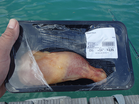 Marco gaat toch eerst met een grote popper smijten helemaal rechts op de steiger zolang die boot voor de duikers niet is gearriveerd. Ik gaat gelijk met dat loodje en aas vissen. Dat is garnaal want we haalden de kip uit de ijskast en Marco ging over zijn nek van de lucht. Niet te geloven gister gekocht, uit de koeling bij ons in de koelbox met ijs en die is niet te harden. We raken hem niet meer aan. Vanaf nu kijken we naar de datum als we iets kopen.