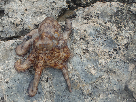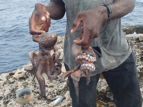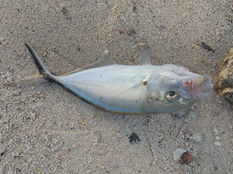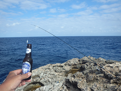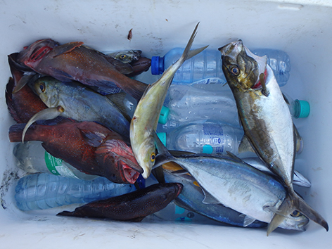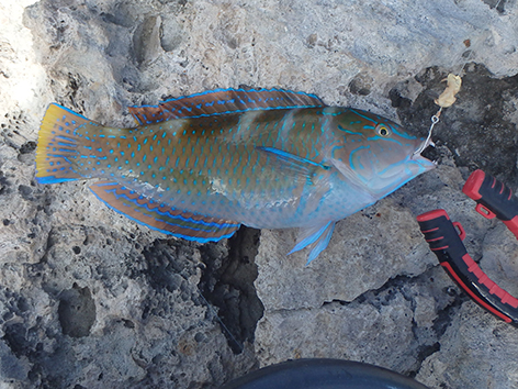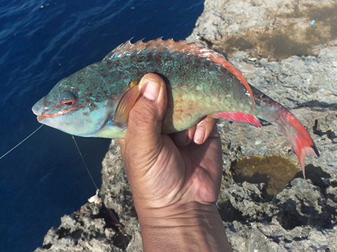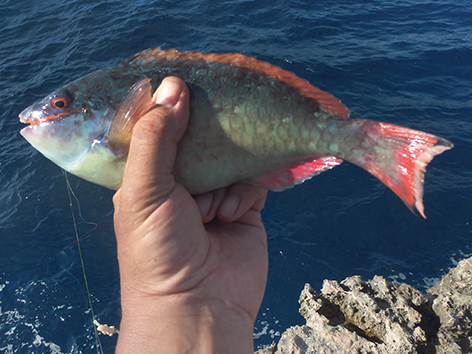 Maar dan komt er al filmend een dame van de duikschool met met koeien letters Crew op haar rug, de buren dus van ons aangelopen. Je mag hier helemaal niet vissen zegt ze en wij doen of we haar niet begrijpen maar ze is onverbiddelijk en houd aan. Weg wezen zegt ze snibbig. Wat een onaangenaam persoon is dat hoe die communiceert en de hele duik school staat te kijken en te filmen op de veranda. We gaan maar weg en we zullen navraag gaan doen natuurlijk. We hebben in ieder geval ons maaltje en daar ging het ons om. Dat is hier zo makkelijk te vangen om de hoek.