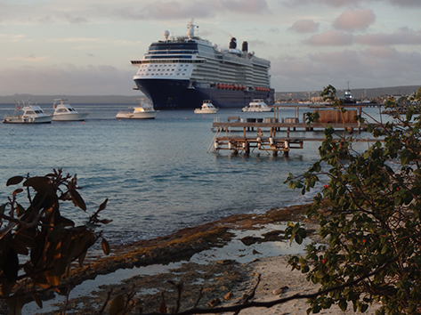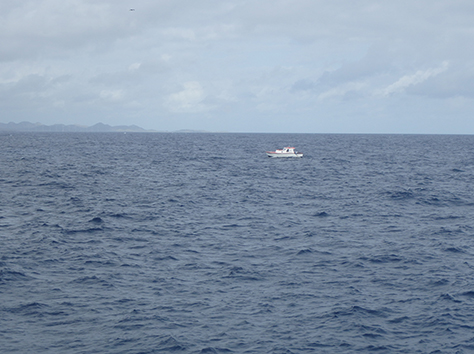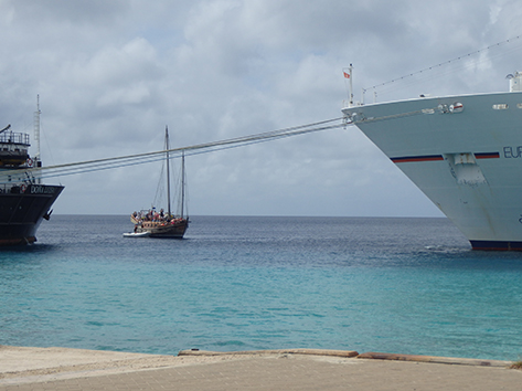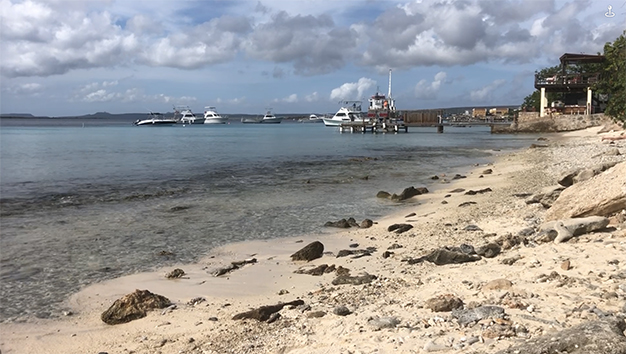 Als ik dan even aan het strandje zit onderweg naar de chinees. Want die is als enigste open hier aan deze kant van Kralendijk. Komt er weer proviand aan op het eiland. Ook het restaurant krijgt wat aangeleverd en dan ziet je hoe lang het duurt voordat die boot aan kan leggen bij de kade.