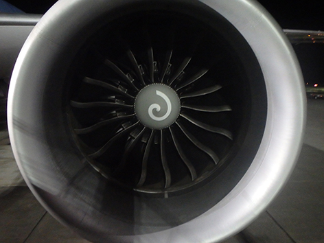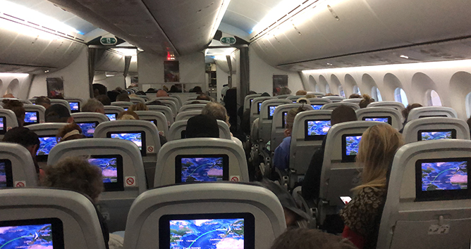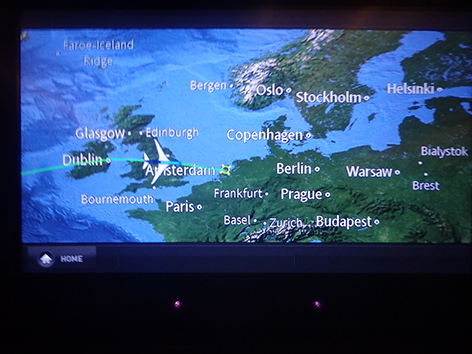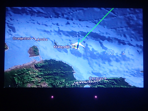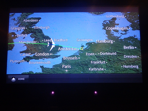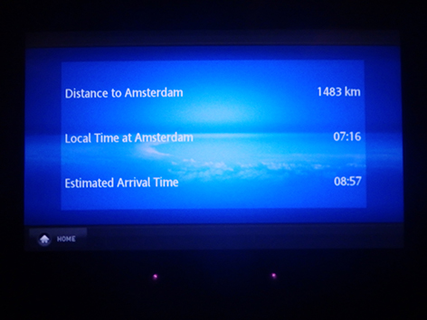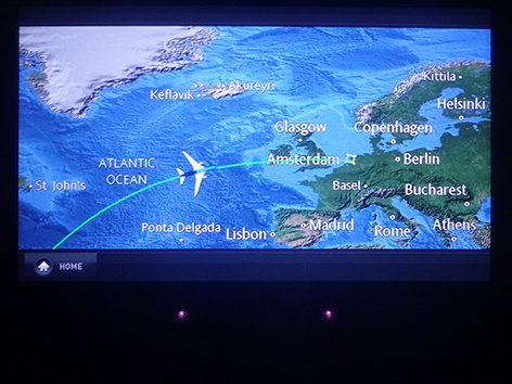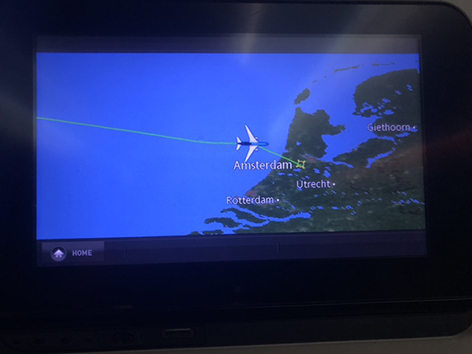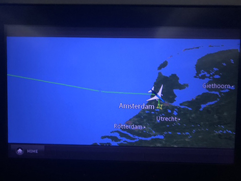 Ik heb al menig rondje gelopen in het vliegtuig. Het is er donker en het personeel vindt dat prima maar voordat ze het ontbijt gaan serveren een uurtje voor aankomst in Nederland is al verteld gisteravond na vertrek toen de lichten uit gingen. Dan neem ik het ervan en staat een dik half uurtje voor in bij de nooduitgang mijn benen te rekken. Met mijn lengte wel even nodig. Terwijl het hele vliegtuig ligt te snurken.