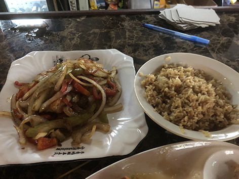 Ik neem na overleg met mijn inmiddels Chinese vriendin een sateetje en wat garnalen in heel veel groente met wat rijst. Ze weet inmiddels wat ik zoek op de kaart en met wat improvisatie met de kok komen we er wel uit. Geen poespas maar graag garnalen in de schil met veel mogelijk knoflook en oelek. Heerlijk zijn ze. Goed gedaan.