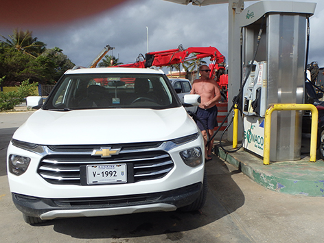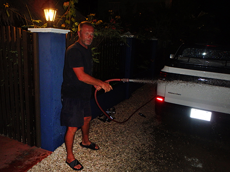 Marco is naar de pomp om de auto van al het zand te ontdoen binnen. Ze hebben goede stofzuiger daar want hij is in een half uurtje terug.