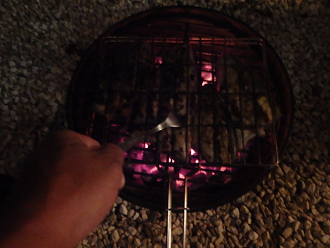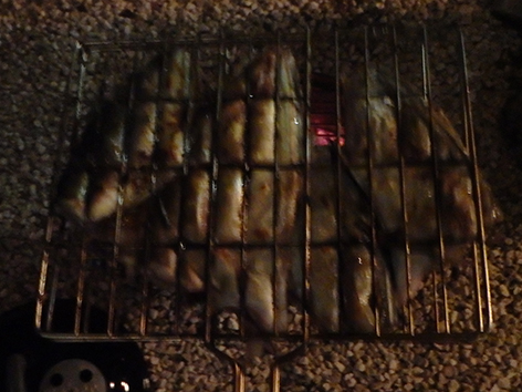 Die vis smaakt heerlijk vanaf de BBQ. Eventjes om en om op de grijze houtskool en prikken met een vork of ze al gaar zijn. Niet te lang dan zijn ze heerlijk sappig en niet droog zoals een paar dagen geleden bij dat restaurant met de red snapper. Wat was dat een afgang. Deze zijn vele malen lekkerder en dat beaamd Marco ook gelijk.
