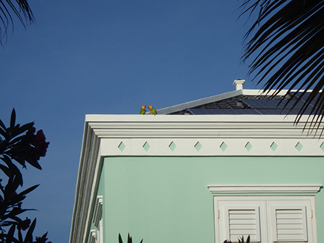 De buren zijn net vertrokken maar de pelikaan blijft onder die lamp.
