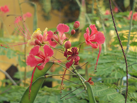 07.55 uur. Op deze bloemen zie je steeds de kolibries zitten van vijf centimeter.07.53 uur. Elke ochtend een heleboel gekwetter in de bomen .Ze zijn altijd met z’n tweeën.