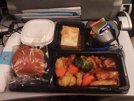 Ik zit in het middenpad aan de rechter buitenkant. Na de maaltijd is er weinig vertier te melden want het licht gaat op een zacht pitje en iedereen trekt een lap over zijn ogen. Zo ook mijn buren. Ik kan slecht slapen zittende in een krappe stoel. Dus een filmpje kijken en muziek luisteren. Ik heb een biertje op bij mijn eten maar mijn buurman een witte wijn. Die zakt zo nu en dan mijn kant op en vroeger zij ik dan. Heb je een kameel liggen beffen. Gelukkig draait die steeds weer snel de andere kant op. Om het uur komen z wel langs met een bekertje water. Ik kan die hele fles wel leeg drinken.