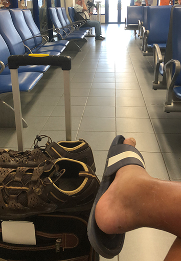 Ik ben één van de eerste die door de douane is. Dat loopt daar vlotjes. Na een half uurtje kleed ik me om. Daar is de temperatuur ook wel naar. Kan je vast wennen zeker want die airco doet het prima hier in de wachtruimte.